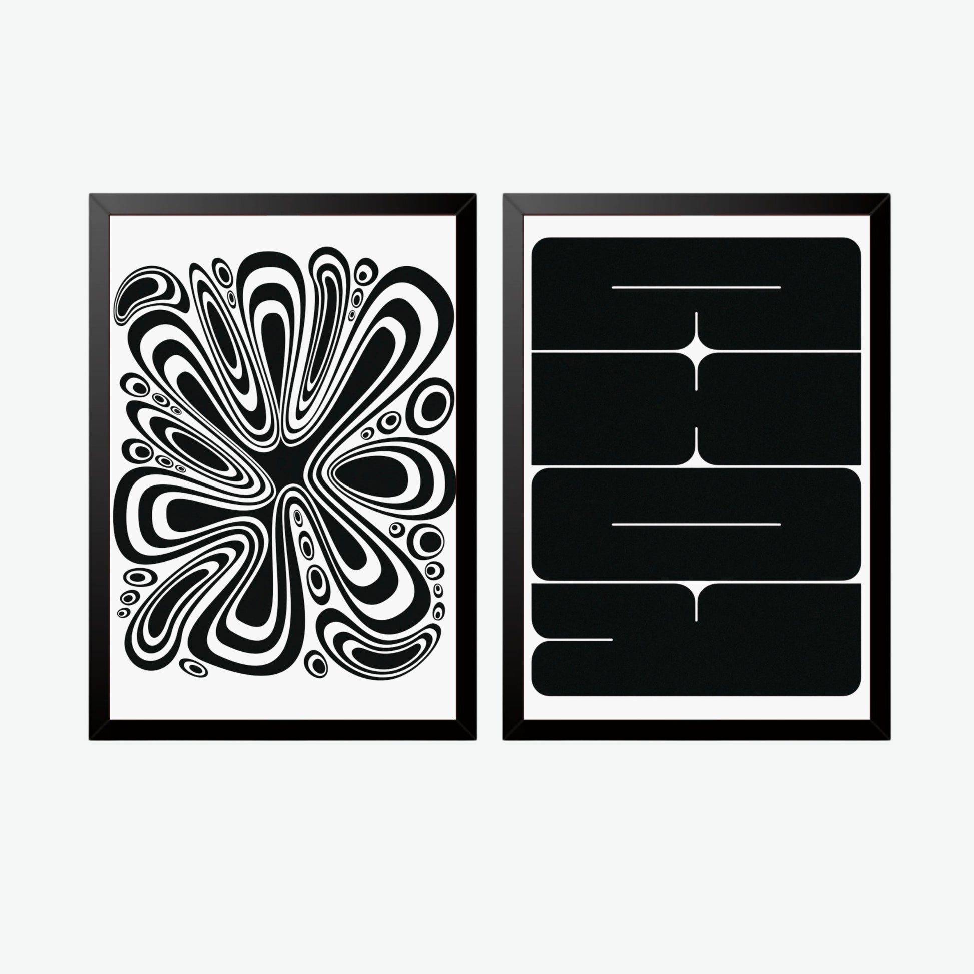 Add a bold modern touch to your space with this black and white abstract poster set. Featuring one fluid, psychedelic-inspired design and one geometric minimal composition, these artworks bring contrast, movement, and style to any wall. Perfect for contemporary homes, studios, or creative spaces looking for a statement piece.