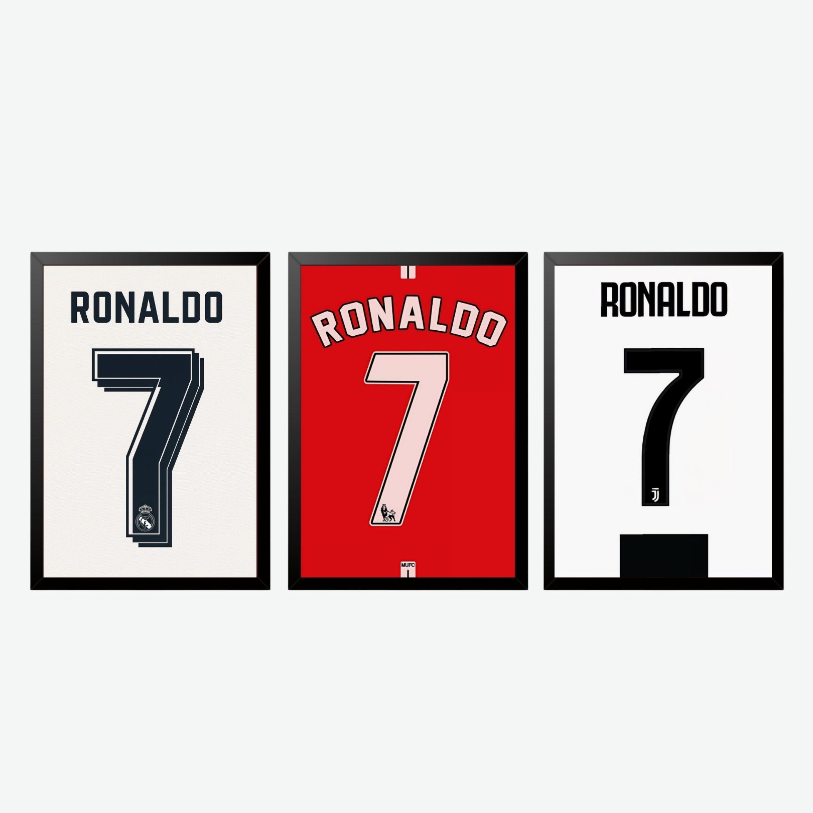Honor the legendary career of Cristiano Ronaldo with this 3-piece wall art set. Featuring his iconic #7 jerseys from Real Madrid, Manchester United, and Juventus, each framed print captures a defining chapter in the journey of one of football’s greatest players. A must-have collection for Ronaldo fans and football lovers.